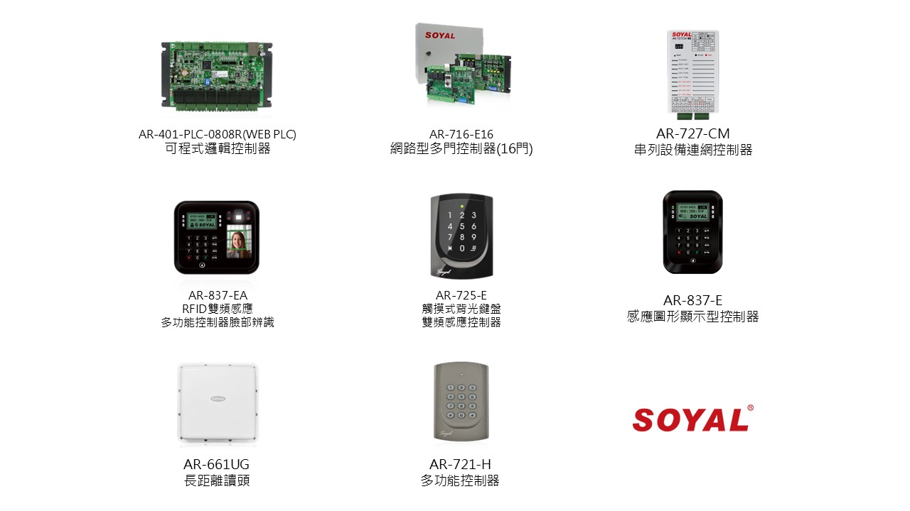 支援Soyal門禁管理設備,包含網路型讀卡機(RFID)、長距離讀頭(e-Tag)等,可另存右圖參考。