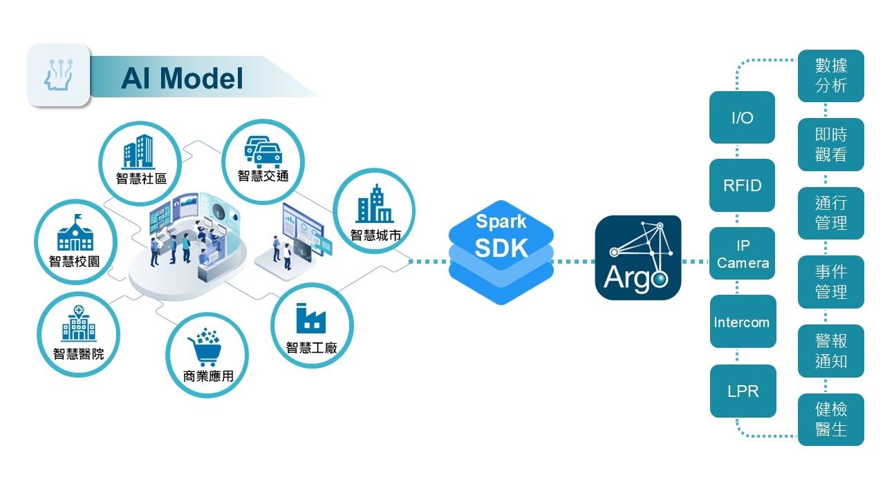 藉由Spark SDK標準化API,輕鬆接入Argo AI VMS,第三方AI模型可結合 Argo 的即時影像處理能力,迅速部署AI功能,加速市場落地。