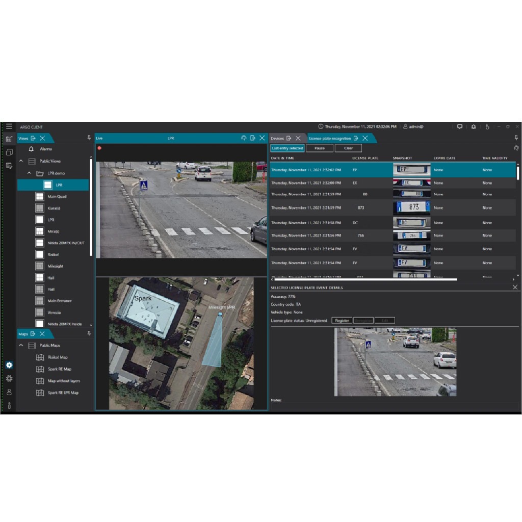 Argo is based on distributed client-server architecture scalable to an unlimited number of servers, devices and cameras. Remote device network setting, creation of multilevel maps, video streams recording and export, event and alarm management.