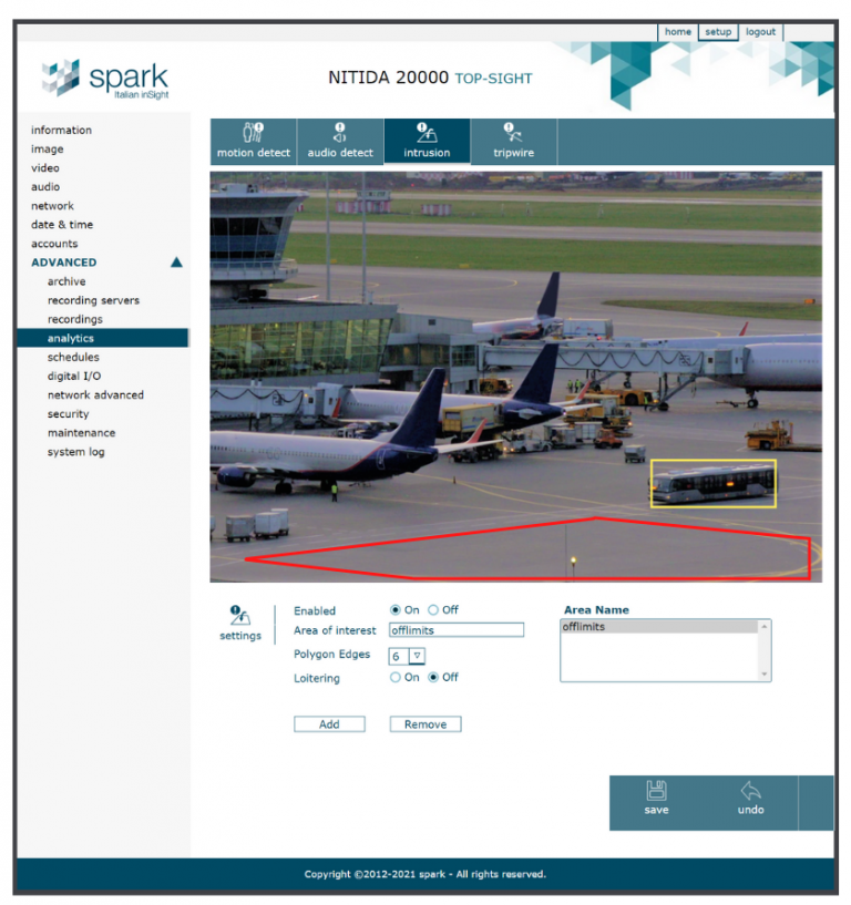 Nitida的影像智能分析可偵測人與車輛,並可針對車輛種類進行分類(汽車、摩托車、腳踏車、卡車、巴士)。另外,可即時追蹤物件以提供精準的周界防護功能,如: 入侵、絆線、逗留。