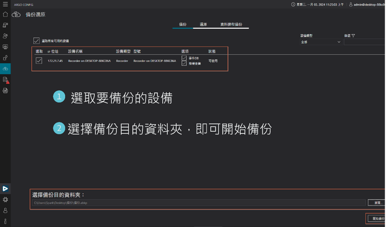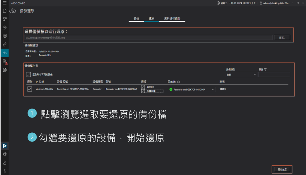 設備還原:透過設備還原,將備份的設定還原至主機 |