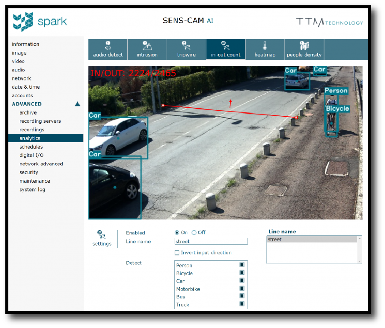 Sens-Cam AI是義大利製,專為高端安全監控、智慧城市及智慧商業應用而設計。這不再是一台單純的攝影機,而是一台具備強大AI的設備,能夠有效分析場景並即時回傳影像及數據。Sens-Cam AI內建神經網絡加速器,可支援多種高階AI應用,包含以下三組AI分析: