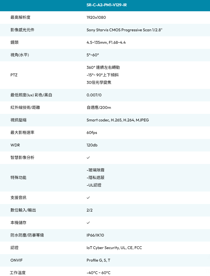 PM 系列為 Omnieye Advanced 中的 PTZ 攝影機,搭載 Sony Starvis 感光元件,具備 30倍光學變焦、360° 連續旋轉與 90° 仰俯控制,可靈活應對大範圍與複雜地形的監控需求。搭配智慧影像分析、雙向語音及玻璃除霧設計,能提供全天候、全場景的主動防護效能,是 交通樞紐、大型商場及其他高密度公共場域的理想選擇。