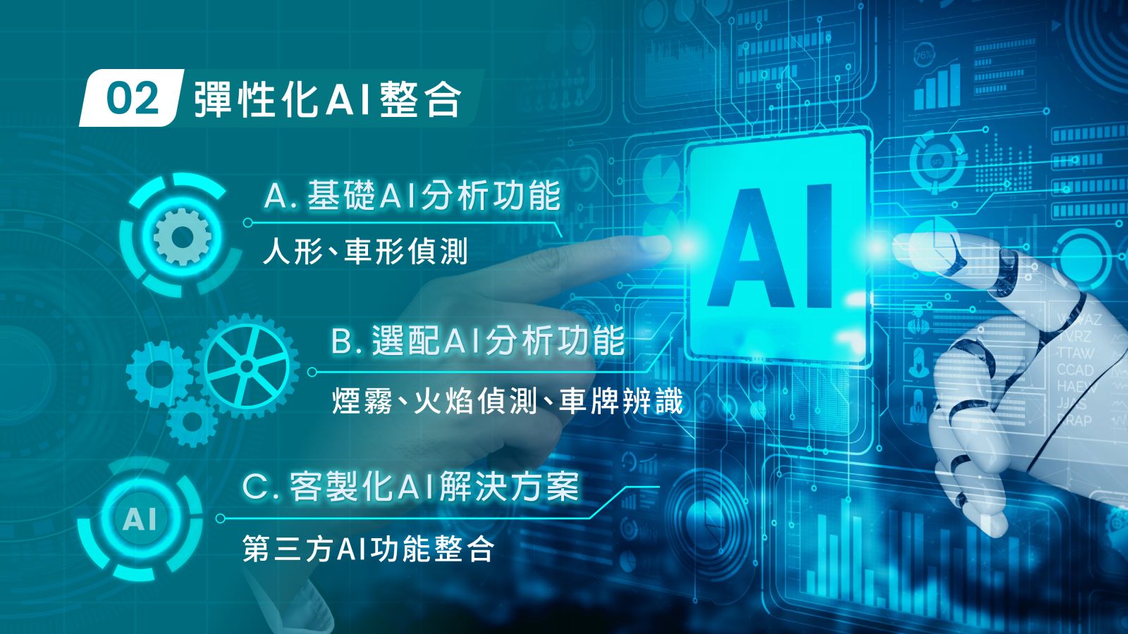 多元精準AI偵測 支援人形偵測(人群/逗留)、車輛偵測(車形/車流)、煙霧偵測、火焰偵測及台灣車牌辨識。具備多元功能,包含物件跨線與計數偵測、周界區域偵測,透過AI精準判斷,輕鬆完成監控任務。 |